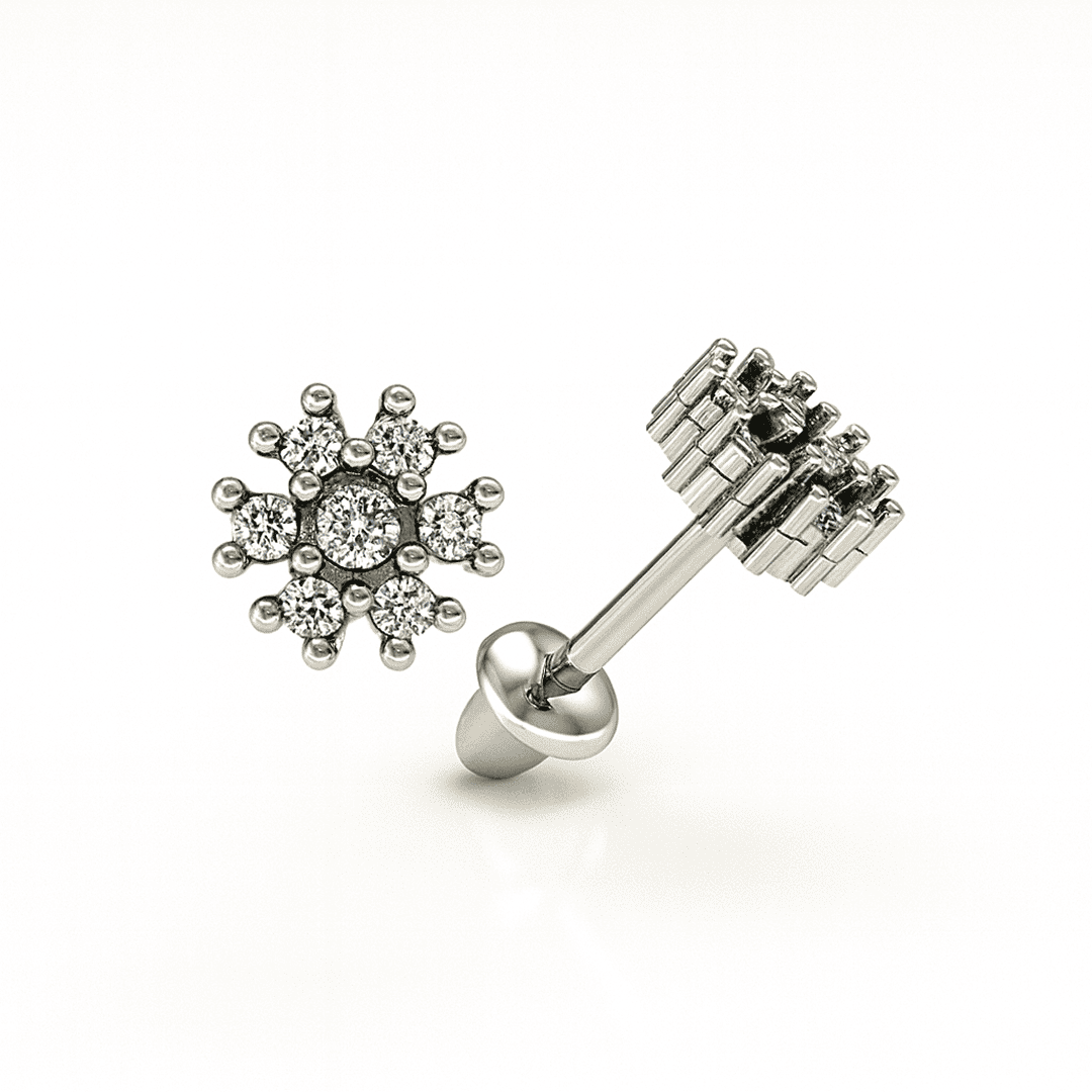 Brinco Ouro Branco Redondo Flor 14 Brilhantes Press Baby