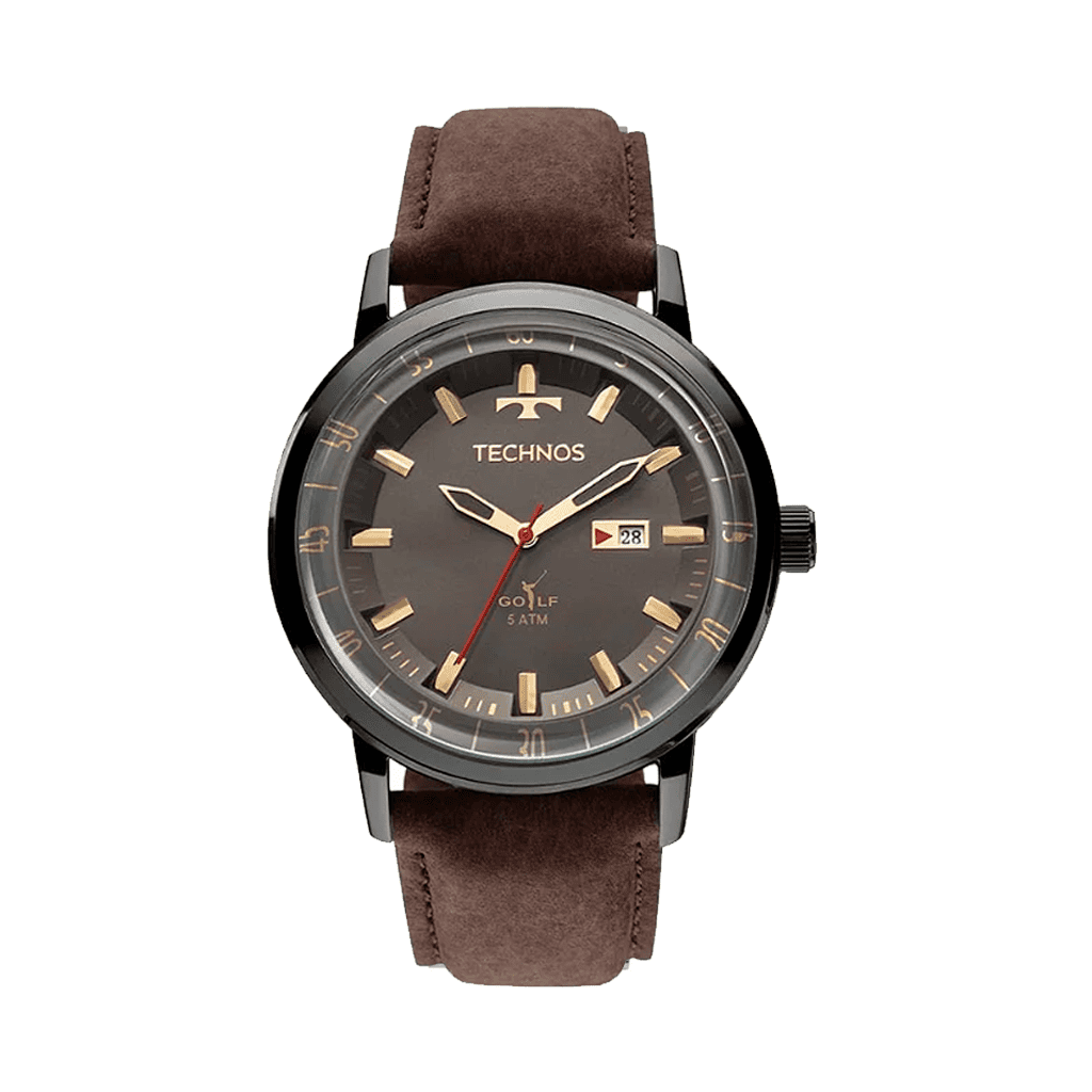 Relógio Technos Golf com design sofisticado e sua tradicional pulseira de couro legítimo. Seu mostrador grafite apresenta o clássico T de Technos na imponente posição de 12h e oferece o contraste ideal entre os marcadores de hora dourados e ponteiro dos segundos em vermelho. Produto 100% em aço inoxidável em banho grafite, com pulseira de couro legítimo na cor marrom, calendário, máquina quartz japonesa Miyota e resistência à água de 50 metros. Tamanho de caixa 46mm.